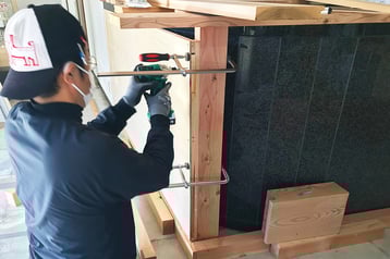 ▲ 仕事柄、いつも大工さんの作業を間近で見ていますが、いざ自分でやろうとするとやっぱり上手くいきません!!下地組みもコツや勘が必要でして、お手伝いいただいたYさんと一緒に頭を抱えながら、「どうやったら固定できるのか!?」など試行錯誤しました。また、この下地が悪いと仕上げも悪くなってしまうので、入念にレベルを見ながら施工。いつもできるだけ現場に通って、大工さんや他の職人さんの手元をのぞき見していた!?ことが大いに役立ちました。設計作業も大事ですが、現場もやっぱり大事ですね!!