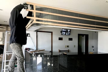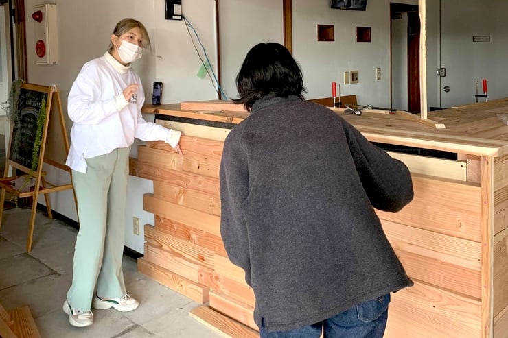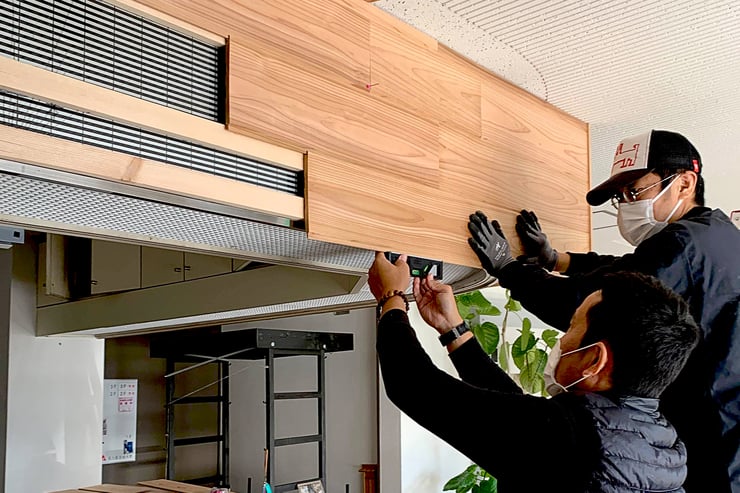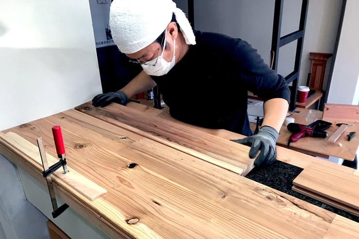 ▲ そして今回のイベント設営全般をお手伝いしている名古屋芸術大学の学生さんにも一部作業にご協力いただき、高尾木製から提供いただいた木っ端を挽き割り、カウンター正面の腰壁部分へ上手く貼っていただきました。流石、芸大生ということもあり、凹凸感をセンス良く納めてくれました!!