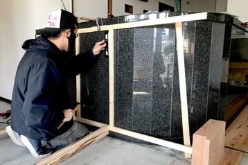もともとはビジネスホテルということもあり、黒い大理石の重厚感ある受付カウンターでした。ただ少々重たい雰囲気ということもあり、以前からナチュラルな「木のカウンター」にしたいという要望がありました。そこにママライフエキスポ2020の開催、また弊所が展示する場所・・など、ご縁が重なりまして「えい!やー!」とDIYさせていただきました!!