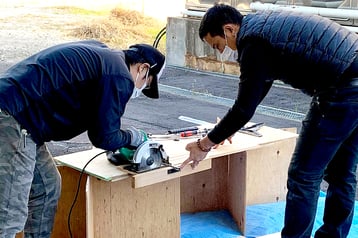 ▲ 今回の作業は大きさや時間的な制限もあり、流石に一人ではできないと判断。このLABOの造作関係の作業へ積極的に関わっているYさんにもお声掛けしまして、二人で一緒に作業を進めました。Yさん、本当にありがとうございました!!(左:Yさん、右:六浦)