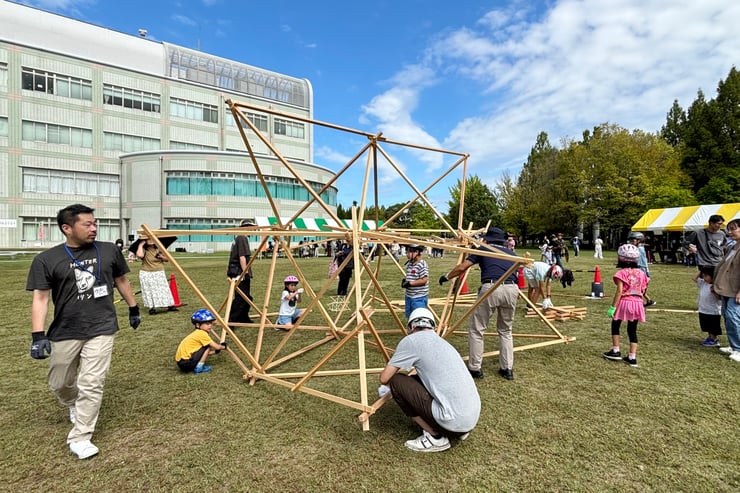 ▲ 午前&午後で各4チーム、1チームあたり8名程度の小学生で構成されています。まずは、割り箸を使って、1/10の模型をみんなで作成します。三角形という基本的な形はあるのですが、慣れてくると子どもたちも思い思いの形を自由に組み上げていきます。まさに、「建築の作業っぽい!?」ですよね!