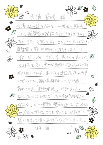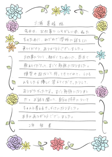 ▲ 生徒たちからのお礼のお手紙をいただき、短時間で詰め込んでしまっている講話なのですが、結構いろいろ感じていることがあるんだな、と思い、すこしピックアップさせていただきます。今後も少しずつバージョンアップさせながら、母校のキャリア教育プロジェクトに参加したいと思います。