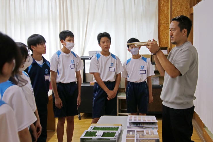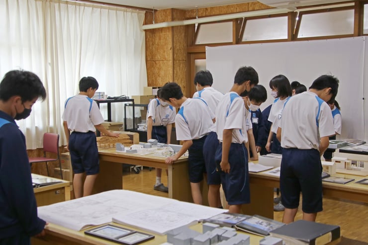 ▲ 展示物の見学時間は毎回真剣な表情で、模型や図面、写真を見てもらっています。ただ、本当はプロジェクトごとに説明をしてあげたいところなのですが、15分程度では到底時間が足りません。そのあたりが非常に心苦しいところです。まぁ話し出すと1時間でも足りないので、悩ましいですね。