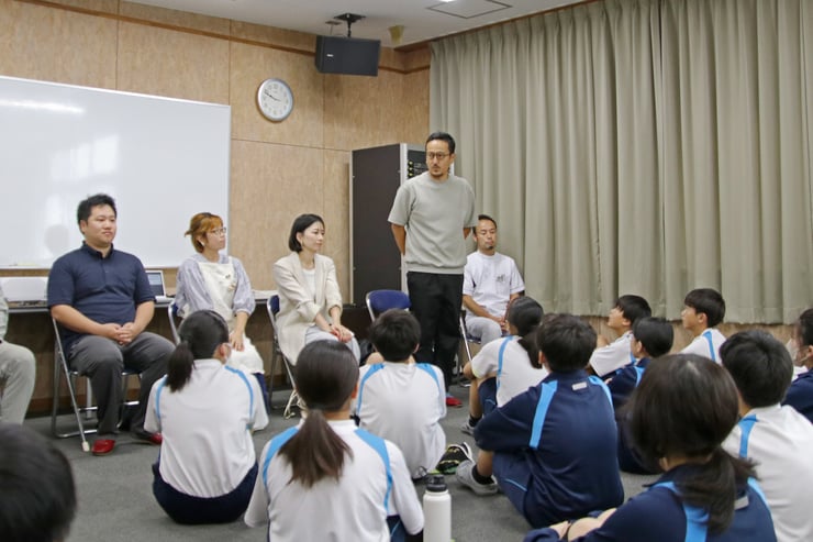 ▲ 職業人を学ぶ会をセッティングしている担当として生徒たちに挨拶。突然の教頭先生からのお願いでしたので、上手く主旨が生徒たち伝わったのか定かではありませんが、今年度の私たち講師10人が、忙しい平日の仕事を調整し、どんな想いでこの場にいるのか、その点をしっかりお話ししました。