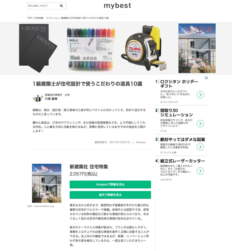 クリエイターがこだわって使用している品々を紹介したサイト「my best」において、普段から住宅設計を行う際に愛用している道具10選を紹介いたしました。