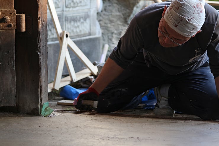 三和土を行う前には、既存柱や土台に負担が掛かっていた柱を仕上げレベルを確認しながら取替え、また土台周辺は直接三和土の土が接しないよう「玉砂利」にて縁切りをしてあります。