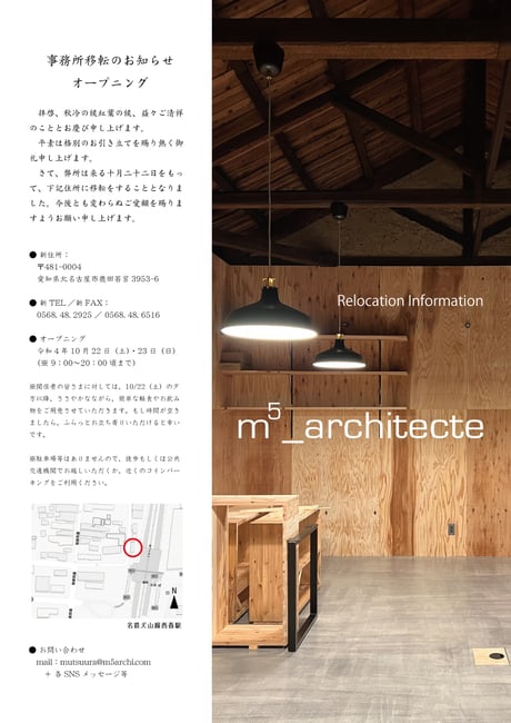m5_architecte の設計業務に関連する、設計業務以外の、ちょっとした日常や報告事項、掲載情報などを写真とともにお届けしています。 プロジェクトとはひと味違う「m5_architecte の日々」を、どうぞのぞいてみてください。