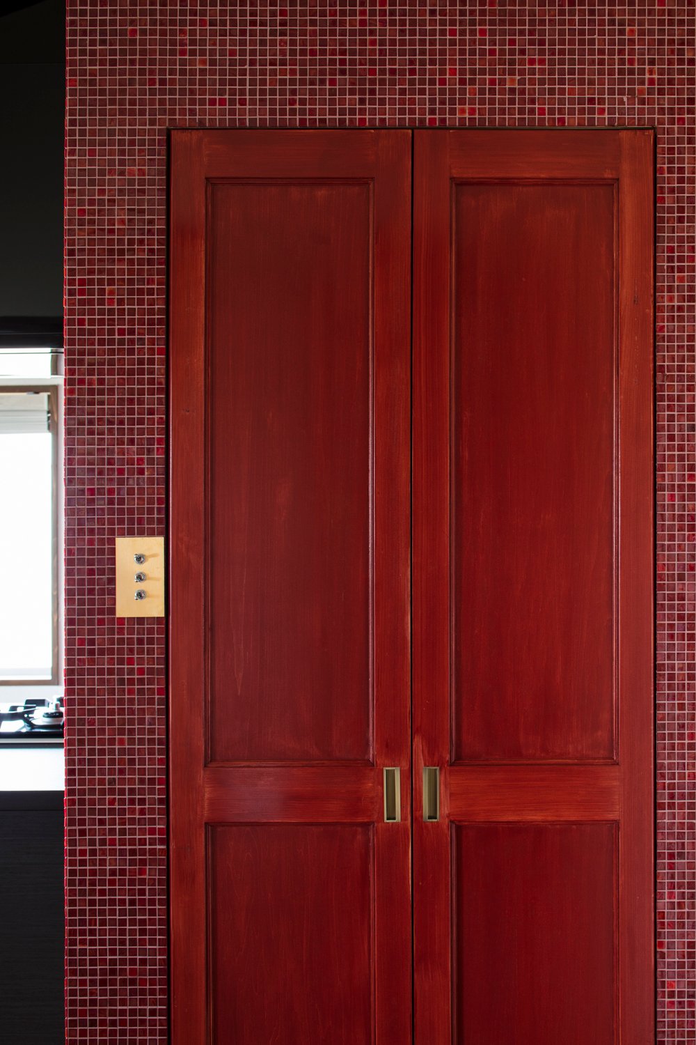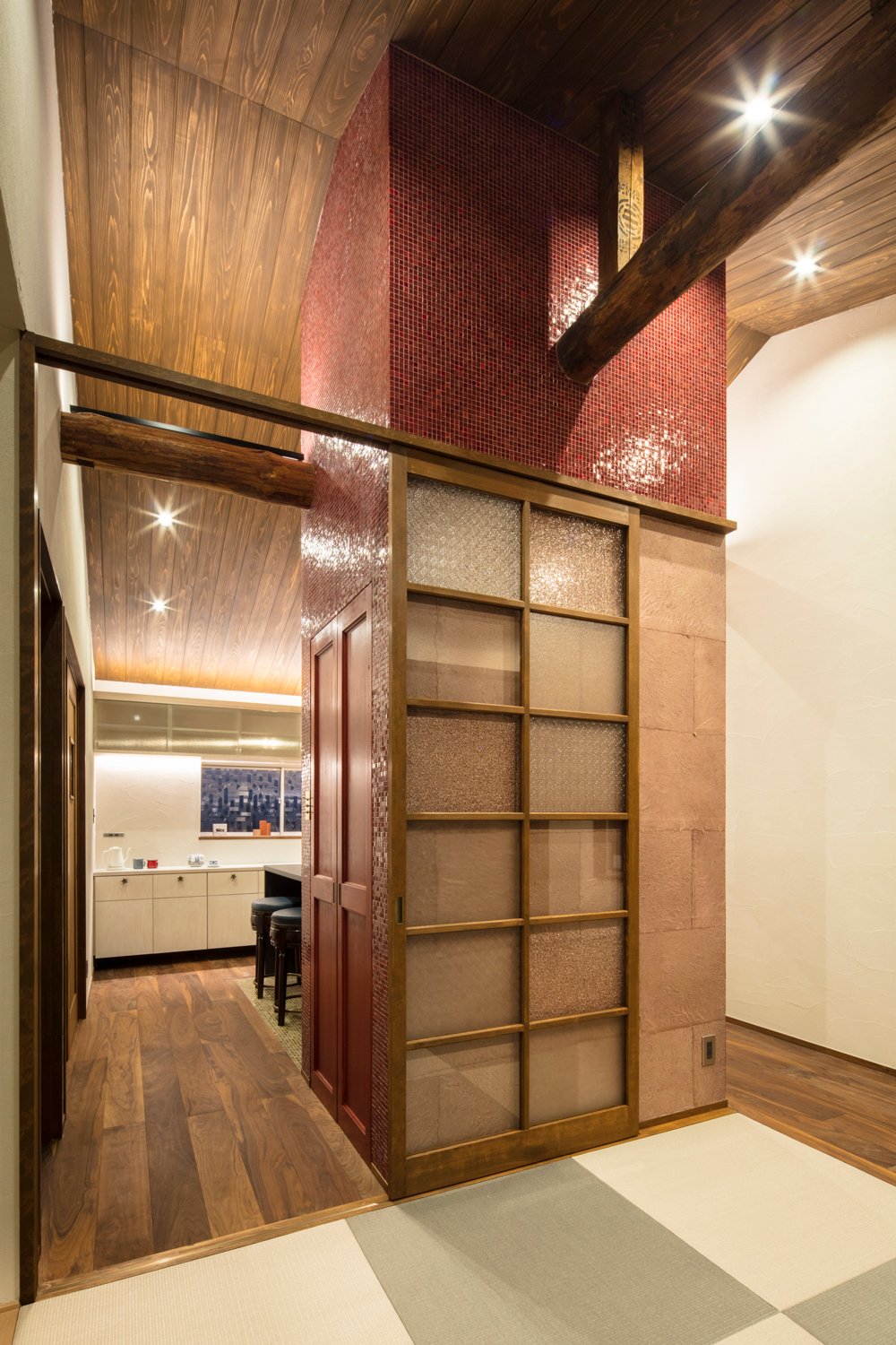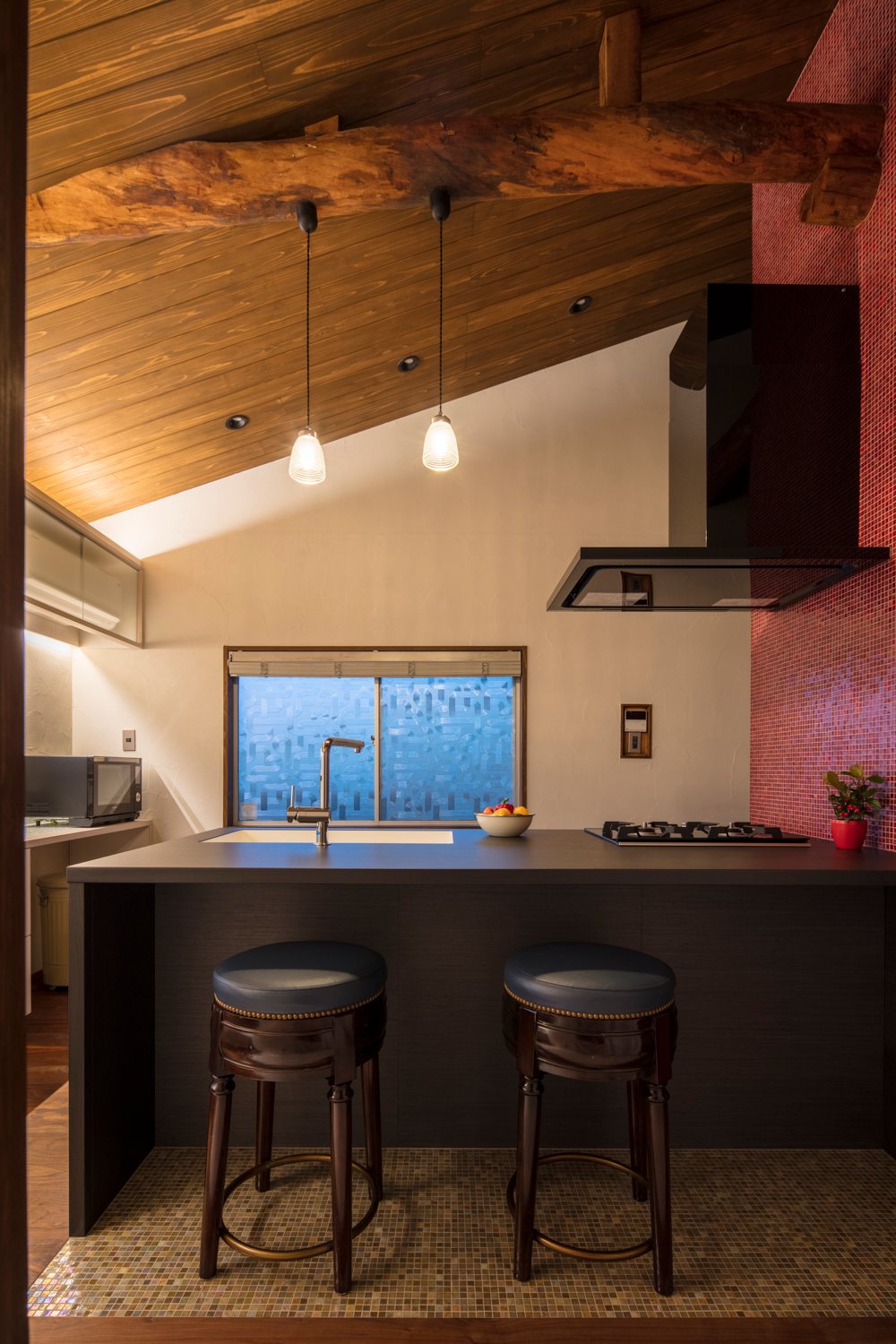 その場所は、視覚的にも生活導線においても中心となる場所です。よって、材料選定で出会った一番想い入れのある素材「=赤いベネチアンガラスのモザイクタイル」を使用することとし、 シンボル的な「真ん中(マンナカ)」を創りました。