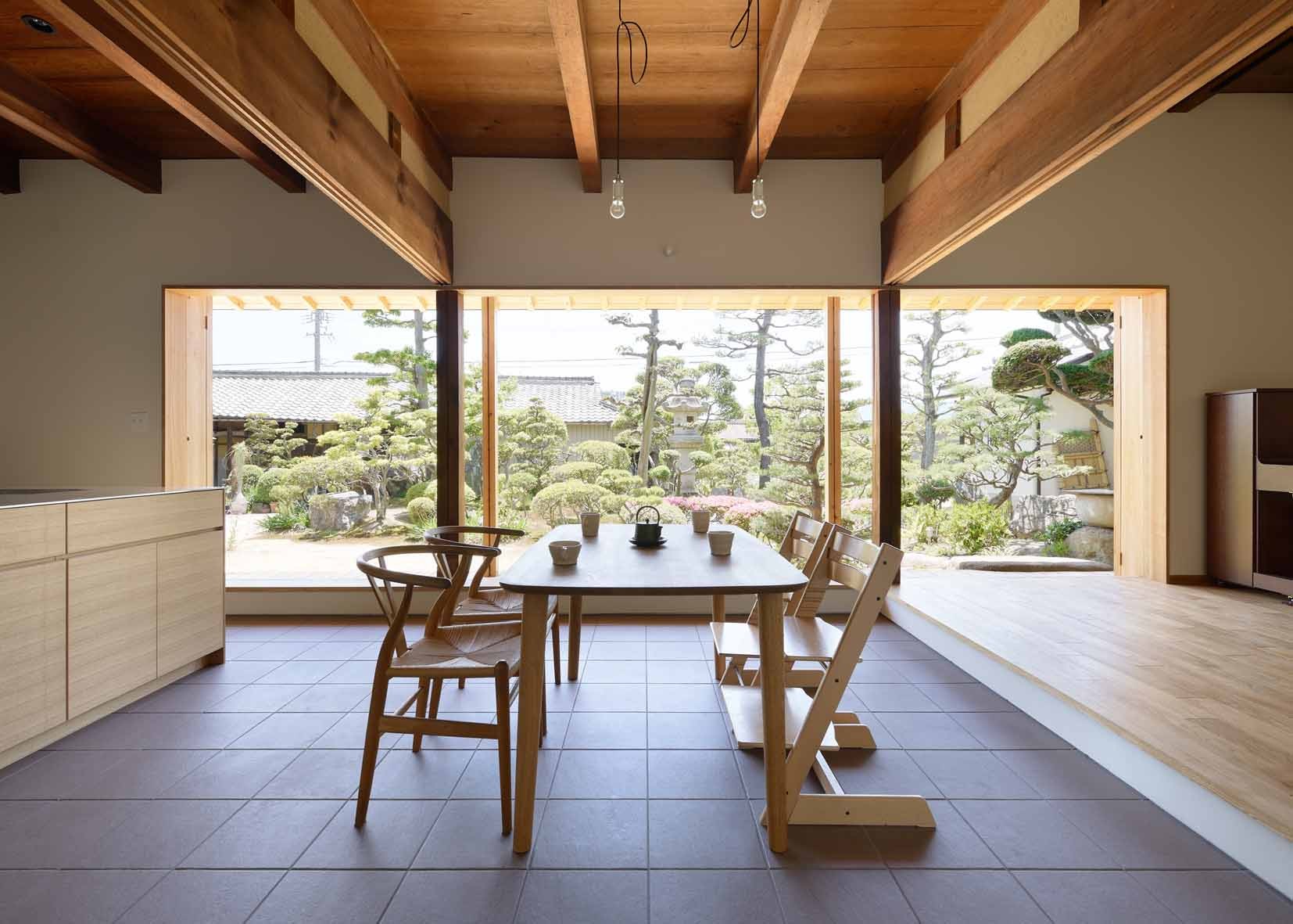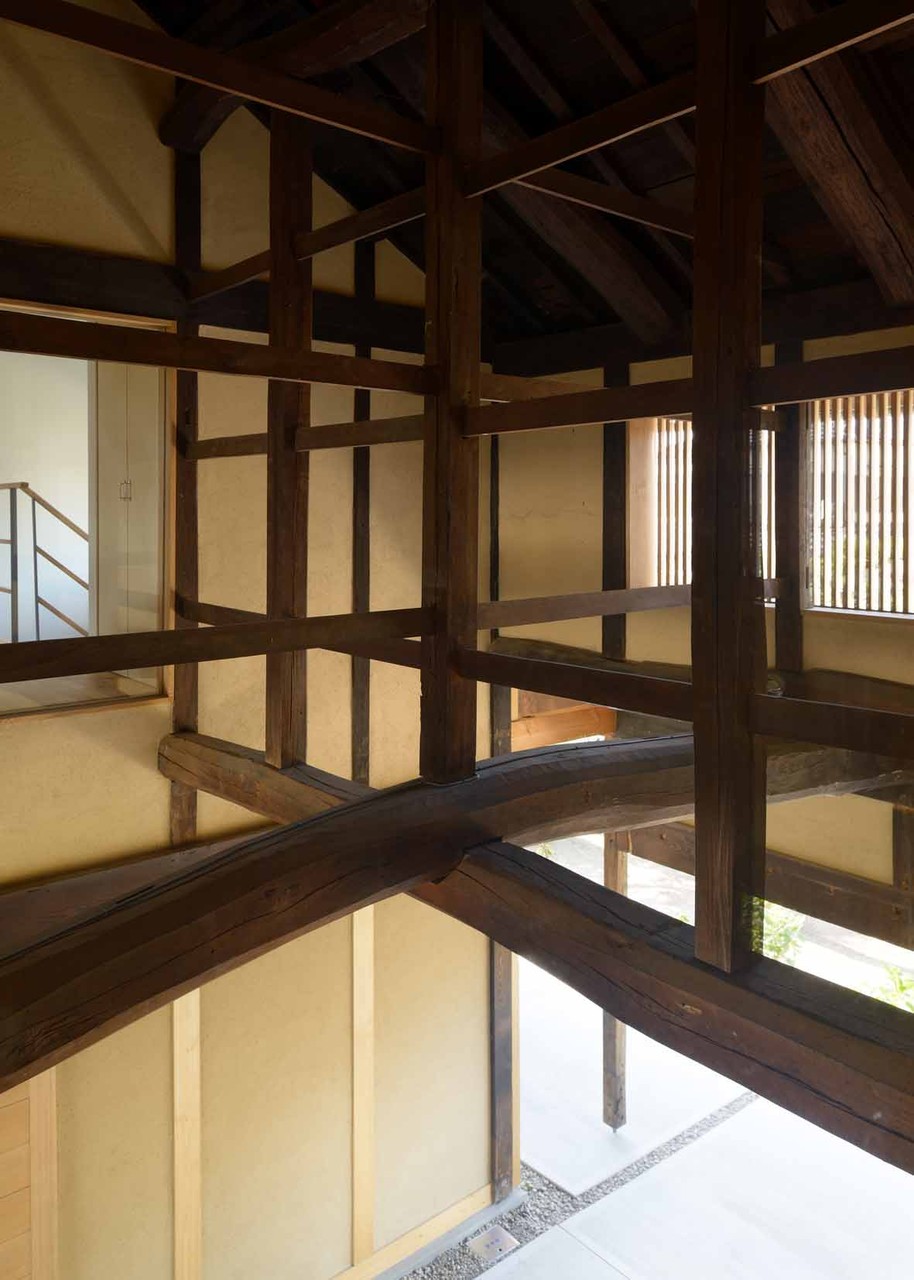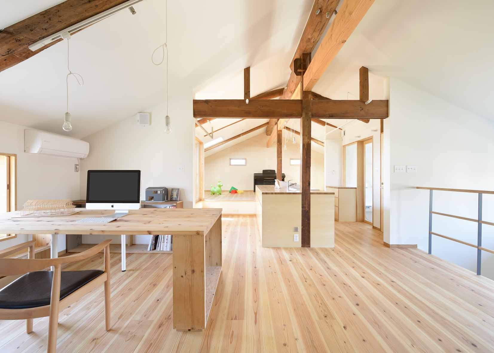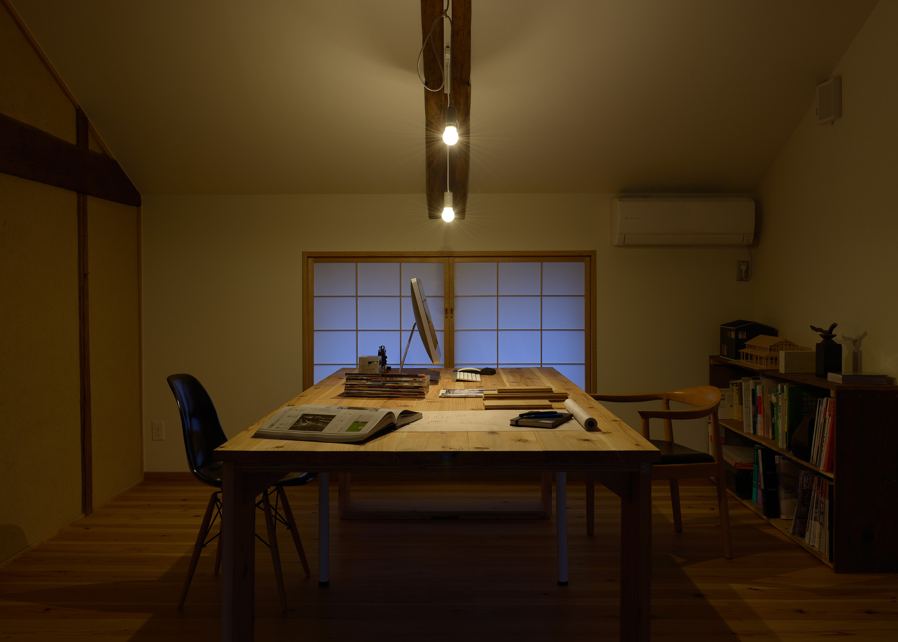 1階は、共用的な用途である、リビングやダイニング、キッチン、仏間を配置し、人の出入りについて意識をしています。2階では、もともと養蚕業のための広い空間であったため、壁のない大きなボリュームをそのままプライベート空間として開放的に使用しています。上下階で役割を分け、且つ通り土間で外部動線を引き込むことを意識しています。