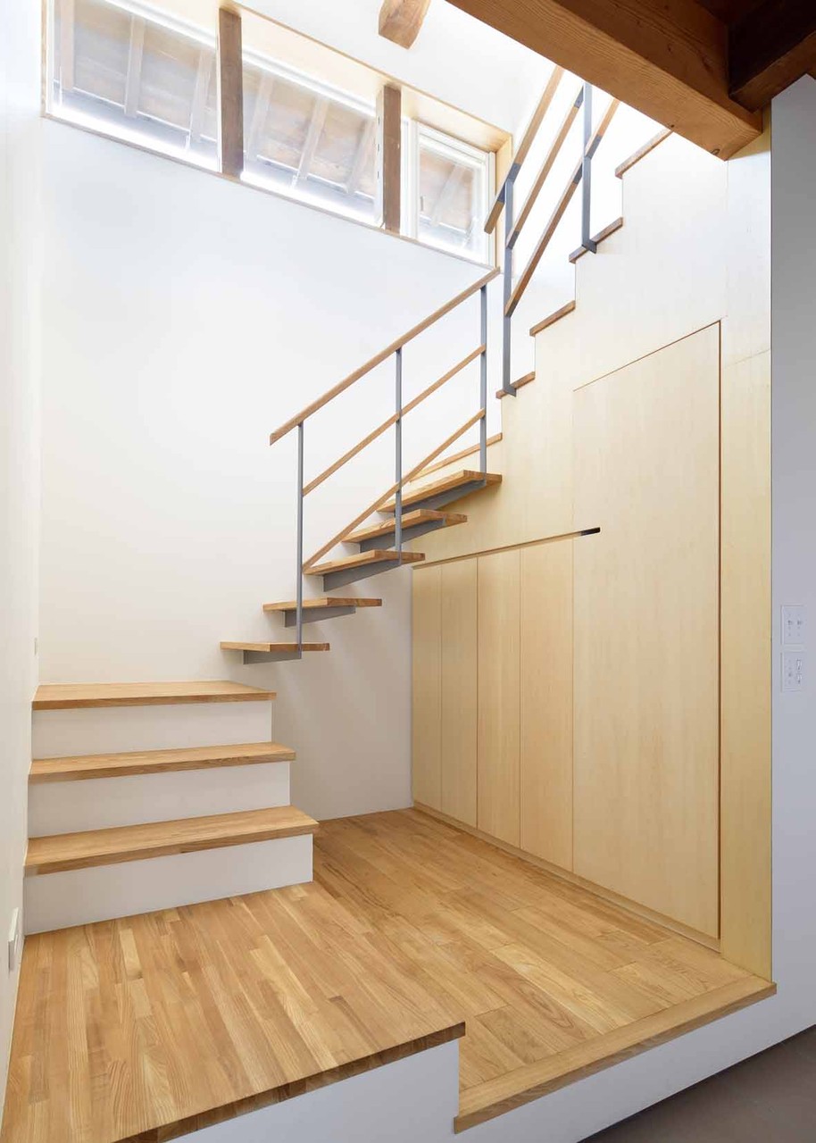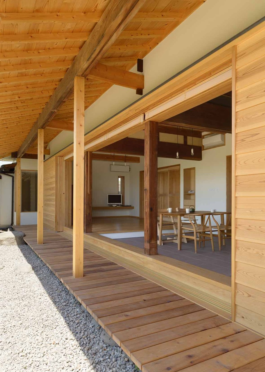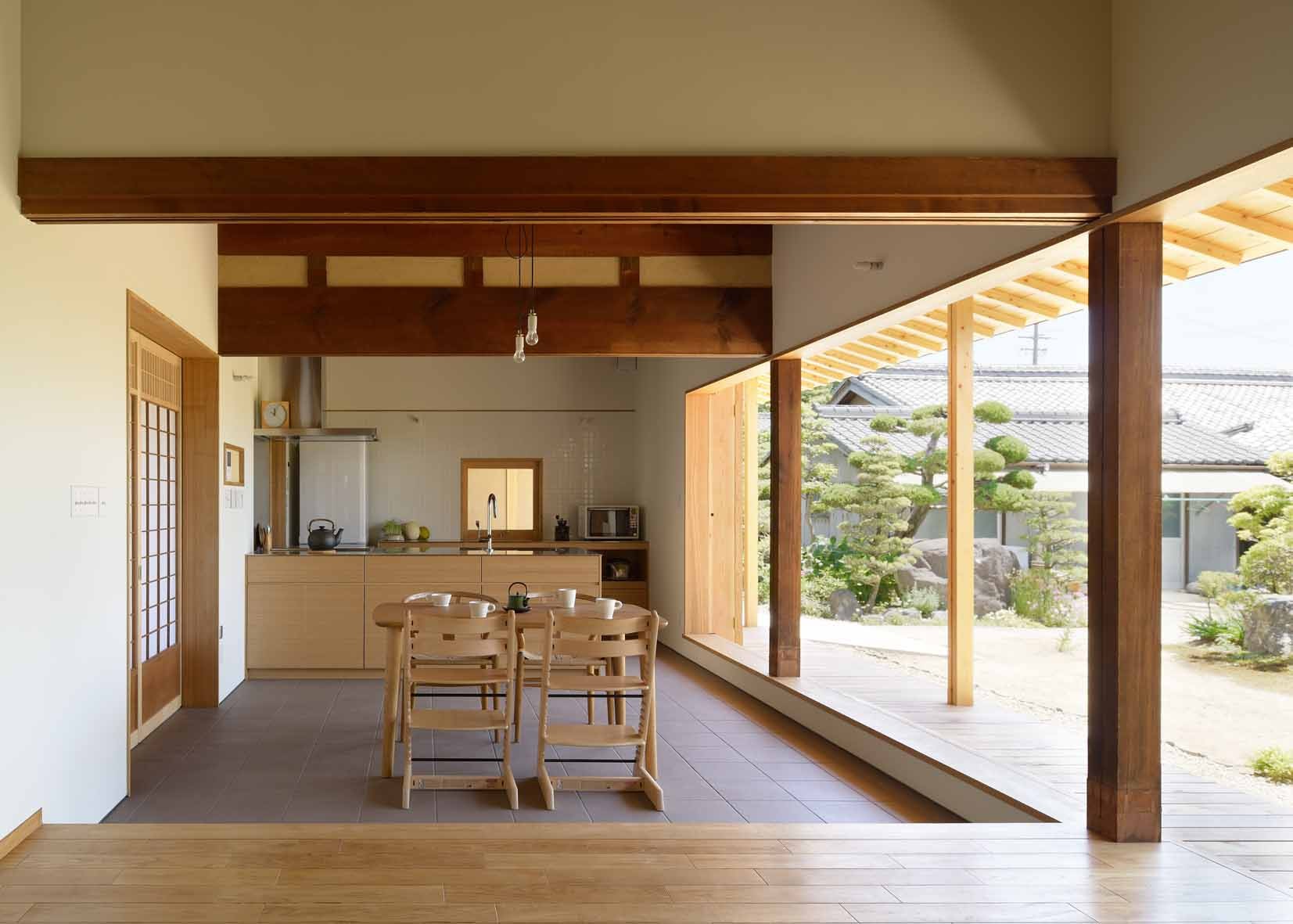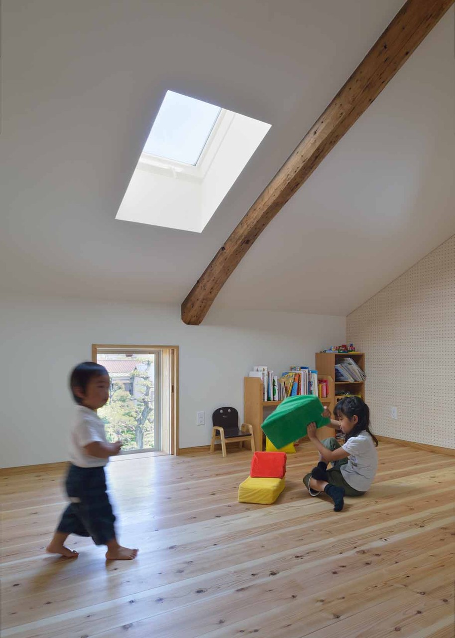 1階は、共用的な用途である、リビングやダイニング、キッチン、仏間を配置し、人の出入りについて意識をしています。2階では、もともと養蚕業のための広い空間であったため、壁のない大きなボリュームをそのままプライベート空間として開放的に使用しています。上下階で役割を分け、且つ通り土間で外部動線を引き込むことを意識しています。